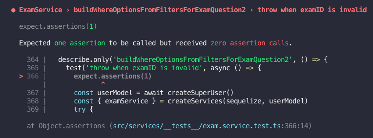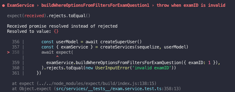 })assertions 코드를 추가하지 않아도 된다. 그 이유는 rejects 함수 안에 assertions 기능이 내재되어 있기 때문이다. assertions 코드 없이 유효한 examID 값인 ‘1’을 부여해도 rejects 함수는 “너가 예상한 에러가 발생하지 않았다”는 것을 알려준다.